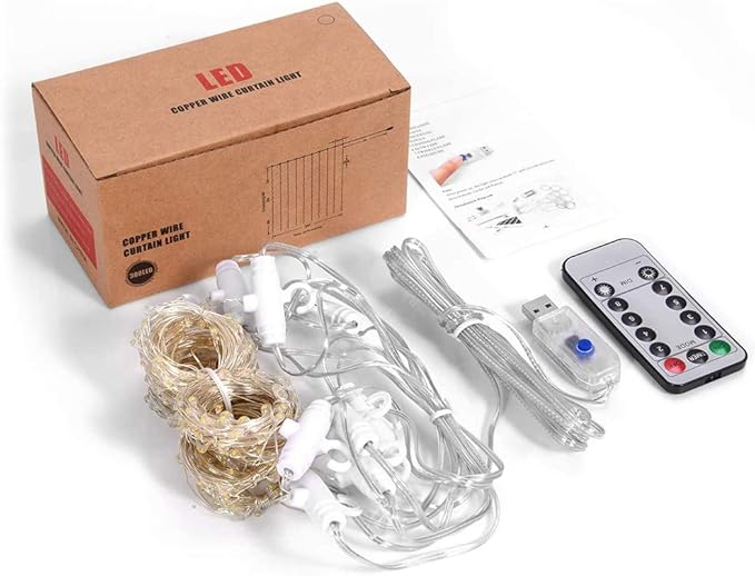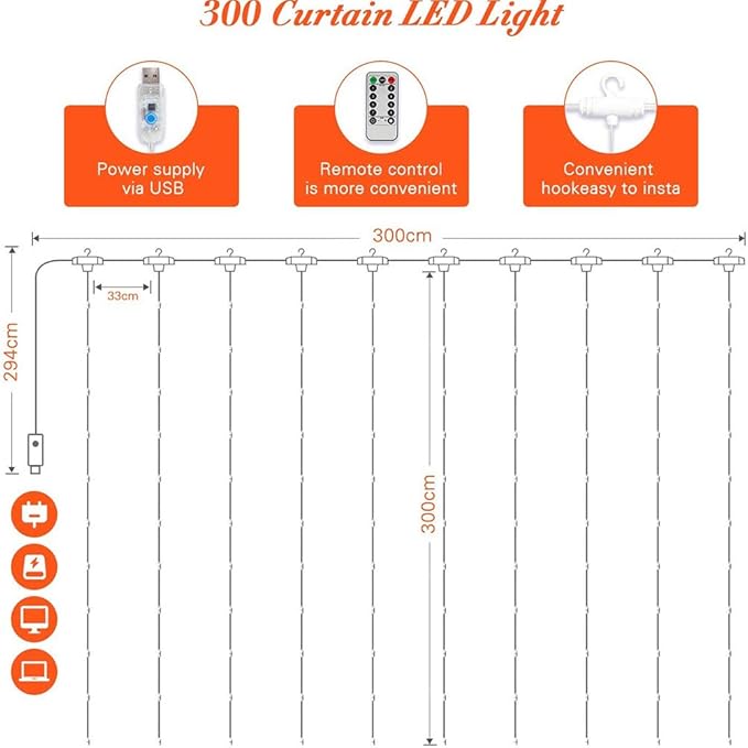- 1. 8 padrões de cordão de luz de cortina – 3 m x 3 m (largura x comprimento), 300 luzes de cortina de LED brancas quentes. Os modos de iluminação incluem mix, flash de onda, flash alternativo, respiração, faixa, flash lento, flash e luz constante; você pode obter o seu modo de iluminação favorito com apenas um botão.